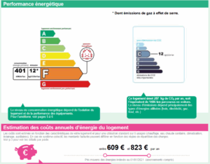 Estimation des coûts annueles d’énergie du logement : Entre 609 € et 823 € par an. Prix moyens des énergies indexés au 01/01/2021 (abonnement compris).